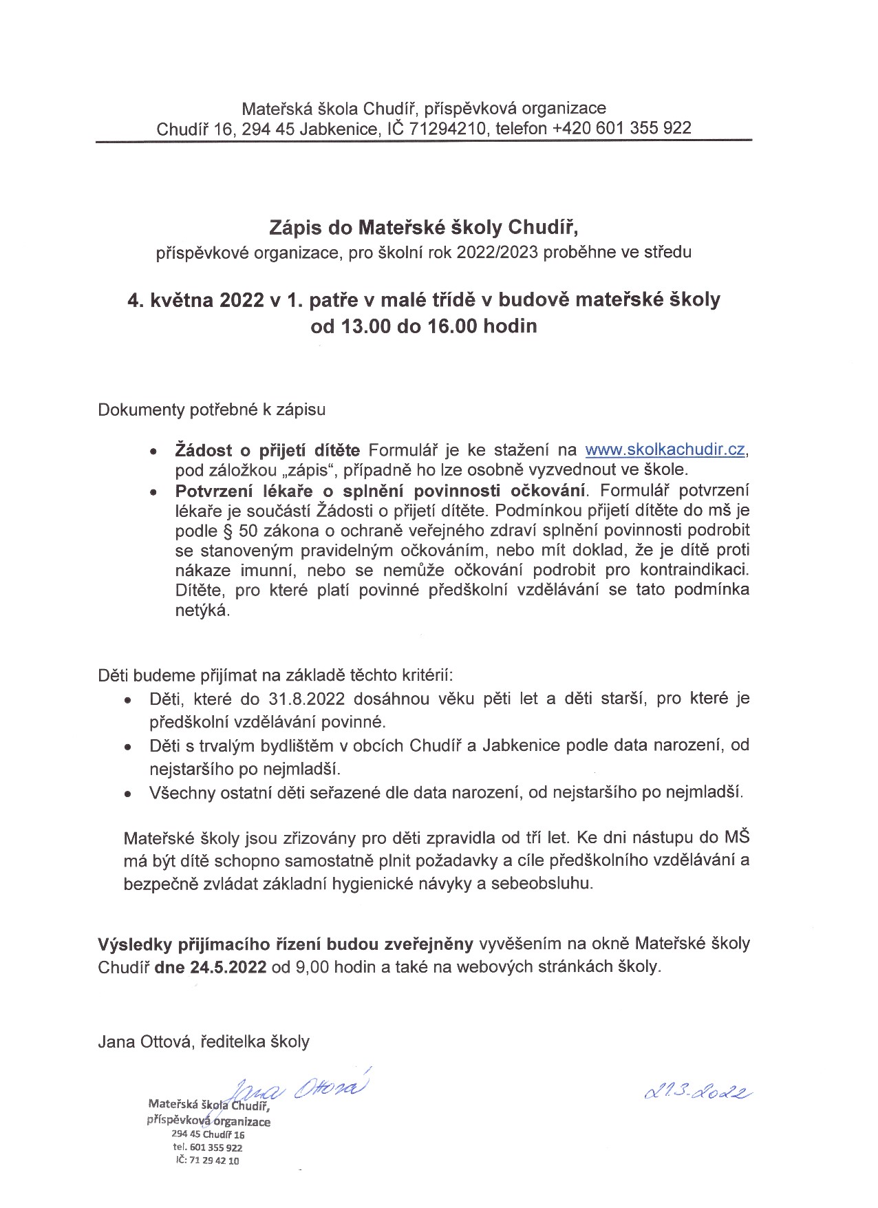 Zápis do MŠ ChudířZápis do MŠ Chudíř proběhne 4.5.2022 od 13,00 do 16,00. Více v příloze.